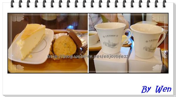 照片中的左邊就是下午茶的餐點,內容有一塊蛋糕,三片餅乾及一杯飲料,右圖是他們贈送的杯子。