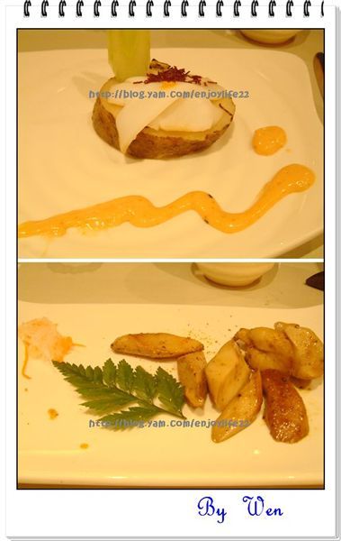 圖二是前菜,他們的前菜是烤杏鮑菇,很好吃哦!杏鮑菇上灑上些許的芝麻、海苔、辣椒粒,感覺很新鮮,也很想問~~~有沒有白飯丫?