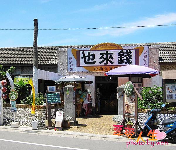 「錢來也」牆壁外觀是利用當地廢棄瓦片、貝殼、蚵殼鋪至而成,屋前掛著金元寶的招牌,象徵生意興隆、財源滾滾。這棟也因為偶像劇「王子變青蛙」而走紅的拍攝場景,經電視劇播出後,曾吸引許多香港遊客前來拍照留影,而逐漸成為當地頗具知名及年輕族群必遊的觀光景點。(文字內容介紹取自於美美旅遊網)